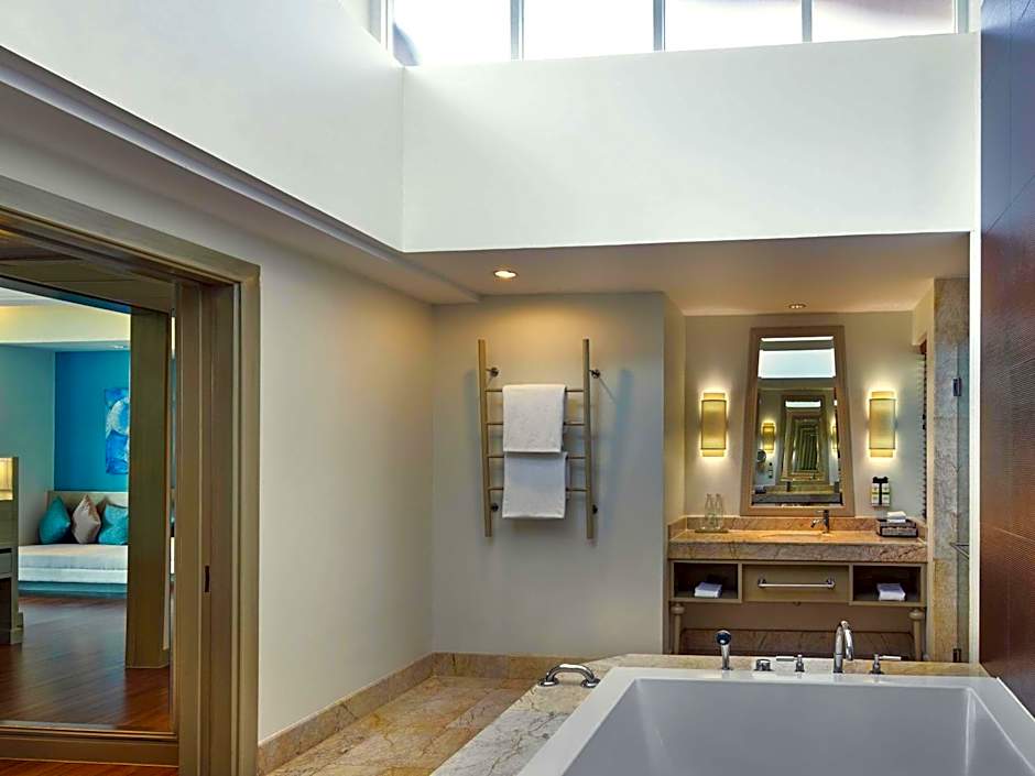 The spacious 150-sqm villa comes with a separate lounge area. Its bathroom features a separate rain shower, a bathtub, coconut cream-colored marble floors and a sliding glass door that opens to the large terrace.